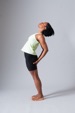 Same posture, reaching both arms overhead. Exhale, pulling in through the abdominal muscles and reach the arms a few inches to one side, creating a C with the body. Inhale to center and repeat on the other side.